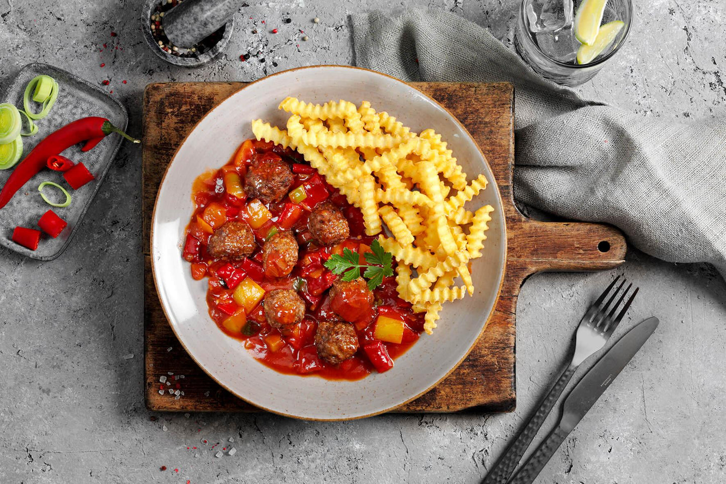 Die Hackbällchen aus unserer hauseigenen Metzgerei werden von Hand für Dich zubereitet und anschließend mit unserer scharfen Porree-Paprikasoße kombiniert. Passend dazu serviert Dir HOFMANNs krosse Pommes Frites, die das tiefgekühlte Premium-Gericht hervorragend ergänzen.
