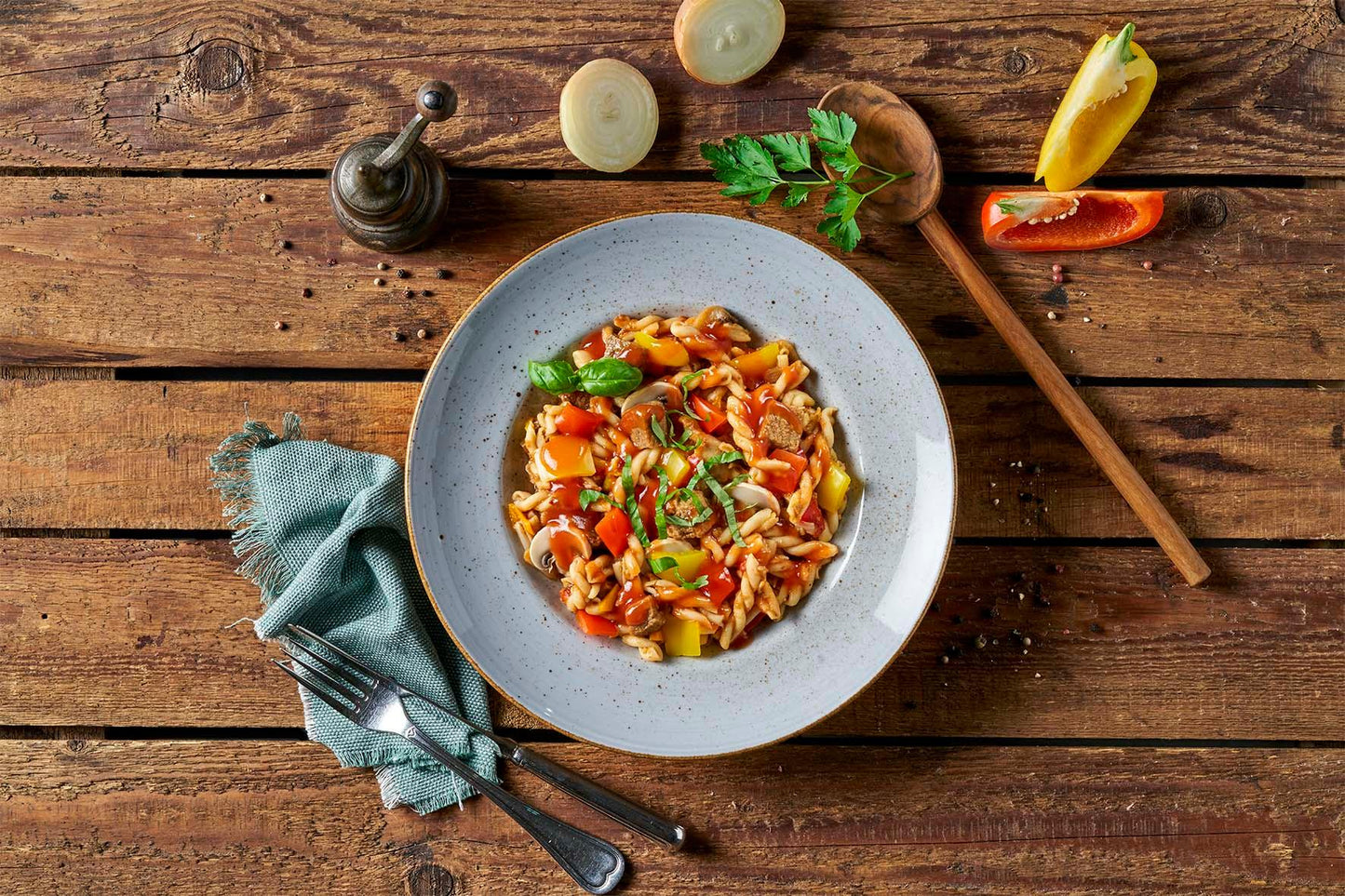 Gemüse in veränderlichen Gewichtsanteilen (51%) (Gemüsepaprika, Zwiebeln, Champignons), Schlingli-Nudeln gegart (Wasser, HARTWEIZENGRIEß), Rindfleisch (15%), Wasser, Tomatenmark, Kräuter, jodiertes Speisesalz (Speisesalz, Kaliumjodat), WEIZENMEHL, modifizierte Stärke, Rapsöl, Gewürze (enthält SELLERIE), Zucker, Apfelessig, Dextrose.