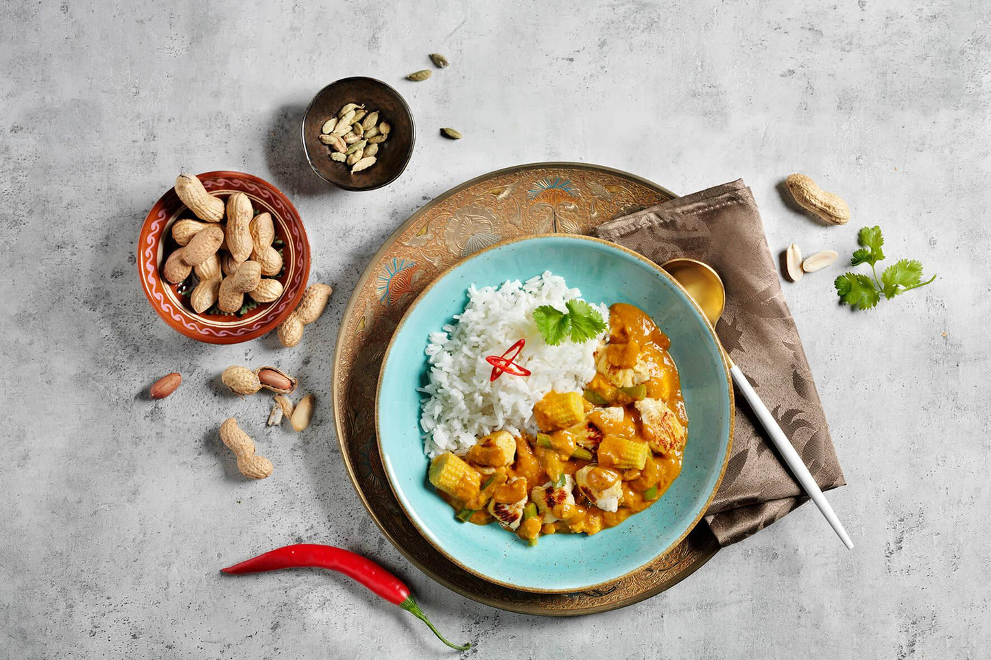 Das Curry basiert auf unserer hausgemachten Erdnuss-Soße , zarten Hähnchenbruststücken und duftendem Basmati-Reis als Beilage. Verfeinert mit leckerem Gemüse – geschnittenen Maiskolben , grünen Bohnen und Zwiebeln – sowie knackigen Erdnussstückchen , wird das indische Flair dieses Gerichts perfekt.
